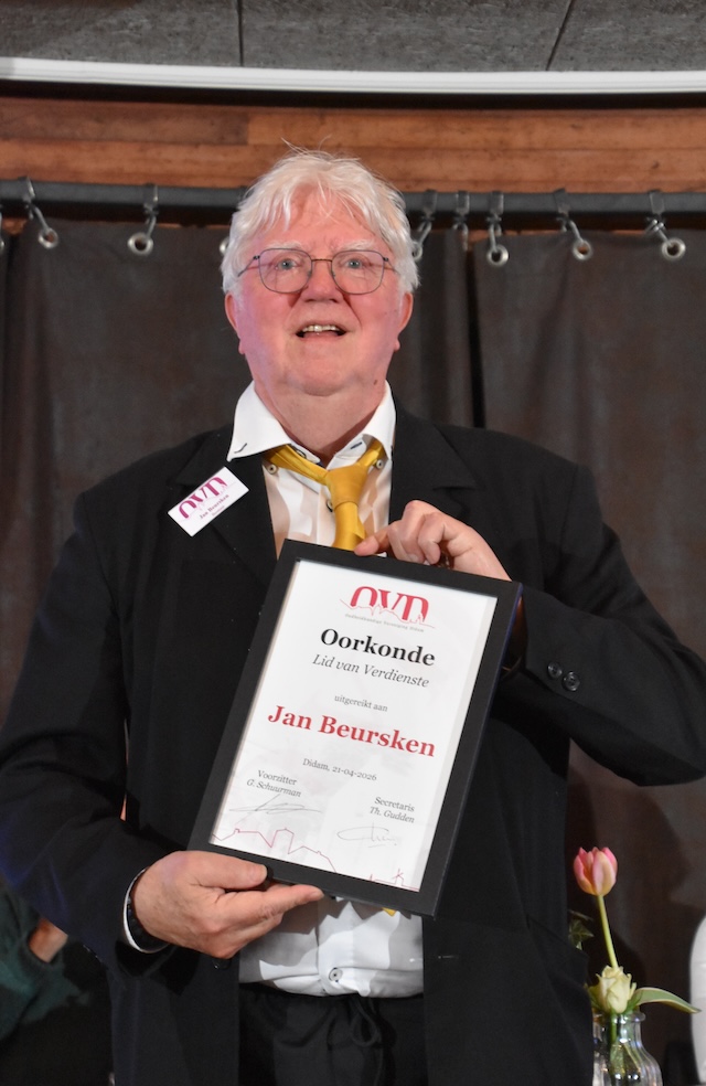Op dinsdag 21 april 2026 was de jaarlijkse ledenvergadering van de OVD bij Plok. Er was een bestuurswisseling; Willy Hammink stopt en Rudy Staring neemt zijn rol over. Ook werden twee leden benoemd als Lid van Verdienste, Henk Stevens en Jan Beursken. Beiden hebben ontzettend veel voor de OVD gedaan (en nog steeds) . Ze kregen hiervoor o.a. een oorkonde, een trofee en een welverdiend applaus.