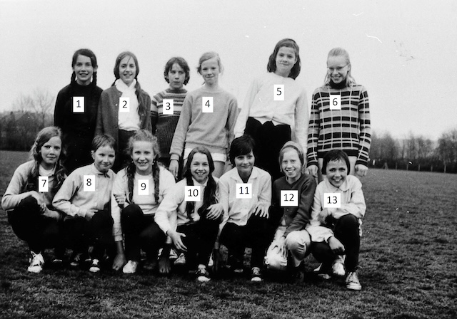 De volgende namen zijn genoemd door Miep Gieling-Schlief en Annie Boerstal-Bolk, die beiden op de foto staan. 1= Annie Godschalk, 2= Zuster Maria, 3= Thea Stokman, 4= Annie Jansen, 5= Carolien Grob, 6= Frieda Stol, 7= Bets Wenting, 8= Joke Beekhuijsen of Corrie Wijers (van een tweeling, zie 16), 9= Marietje Zegers, 10= Fien Welling, 11= Dinie Freriks, 12= Toos Grob, 13= Annie Bolder, 14= Riet Staring, 15= Dinie ter Voert, 16= Joke Weijers (van een tweeling, zie 8), 17= Dinie Siebelink, 18= Miep Schlief, 19= Annie Bolk, 20= Gré Hendriks en 21= Burgermeester H.J.A. Verberk